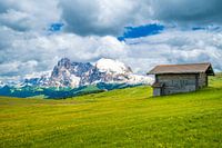 Seiser Alm of Alpe di Siusi - met op de achtergrond de berggroep Sassolungo - Langkofel tijdens de lente in de Dolomieten. Gele voorjaarsbloemen in de weiden en enkele houten chalets op de hoogvlakte in de Alpen, Trentino Alto Adige, Zuid-Tirol, Italië.