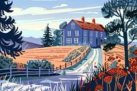 Seizoensgebonden landschap en natuur, vlak beperkt palet. Een serene dorps- en stadsscène met een pad dat naar een bos leidt