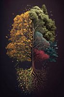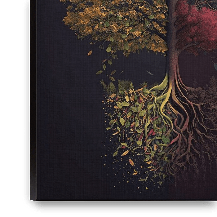 Dit prachtige digitale kunstwerk toont een boom die in twee contrasterende helften is gesplitst. Het symboliseert het verstrijken van de tijd, verandering en de dualiteit van de natuur. De linkerkant van de boom toont gouden herfstbladeren, sommige wapperen in de wind, terwijl de wortels in het levende, ontbindende gebladerte reiken,…