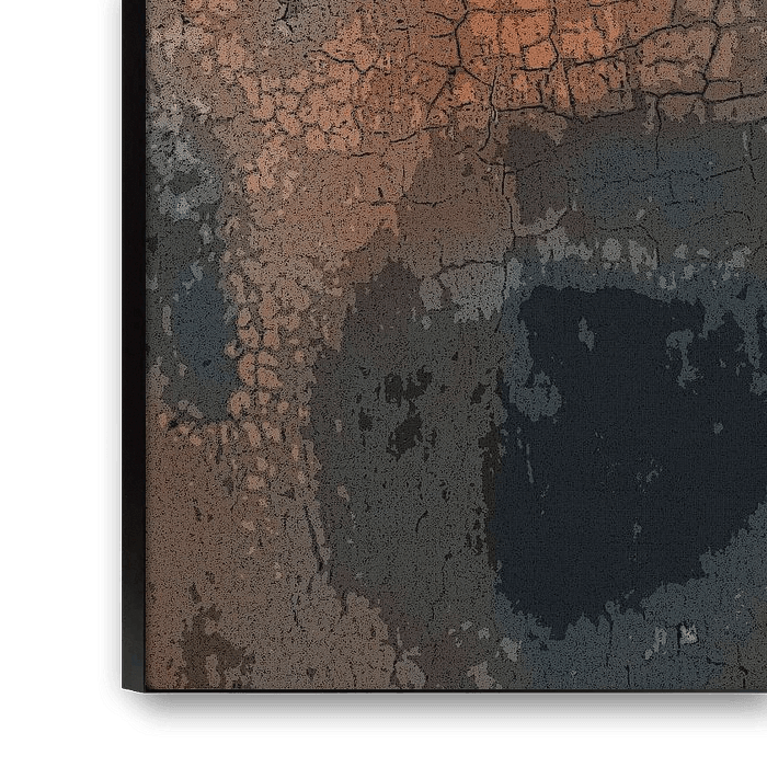 In dit werk vangt de ruwe huid van verweerd materiaal het spel van tijd, zon en stilte. De gebarsten lagen doen denken aan opgedroogde aarde na een lange zomer, waar het licht van Sejnane – een dorp in Noord-Tunesië – zacht oranje overheen glijdt. Elk barstje, elke nuance van roest en schaduw vertelt een eigen verhaal over verval dat schoonheid wordt.