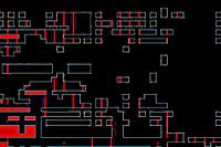 Een abstract werk in rood en lichtblauw tegen een zwarte achtergrond.