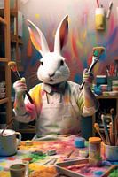 Een kleurrijk creatief konijn in een rommelig (zachtjes uitgedrukt) atelier.