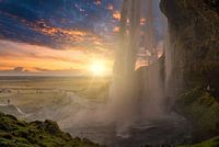 Deze prachtige foto toont de majestueuze Seljalandsfoss waterval vanuit een uniek perspectief. Het beeld is genomen van achter de waterval, waardoor je een adembenemend zicht hebt op het water dat van grote hoogte naar beneden valt. De laagstaande zon zorgt voor een warme en kleurrijke lucht, die de natuurlijke schoonheid van de…