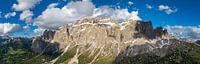 Het Sella-gebergte in de Dolomieten in de lente gezien vanaf een hoog uitkijkpunt. Panoramafoto toont de volledige breedte van de berggroep van het Val Gardena tot de Sellapas.