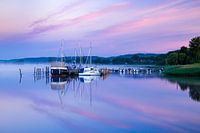 Boten op de Selliner See in de vroege ochtend, kort voor zonsopgang, op het eiland Rügen. Op de achtergrond ziet u het jachtslot Granitz.