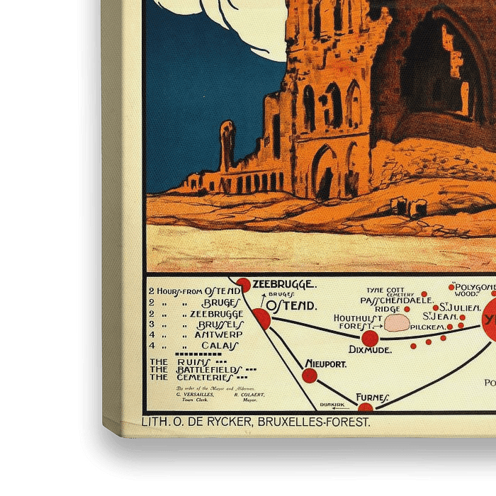 Koop dit moderne kunstwerk Selly, Reisposter Ieper België WO I Ruïnes, jaren 1920 van Atelier Liesjes op canvas, aluminium dibond, (ingelijste) fotoprint, behang en ArtFrame, op maat geprint in Fine-Art kwaliteit.