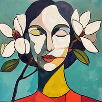 Dit semi-abstracte schilderij combineert vrouwelijkheid en natuur. Het kunstwerk toont een vrouwelijk gezicht met gesloten ogen. Haar gelaat wordt omlijst door grote, witte magnoliabloemen, die symbool staan voor elegantie en een subtiele verbinding met de natuur. De lijnen zijn sterk en vloeiend, wat het portret een grafische en…