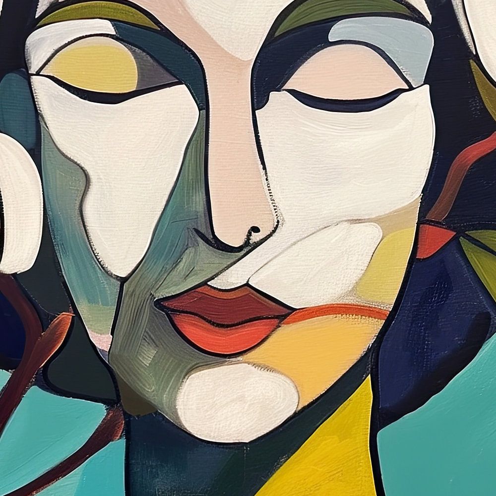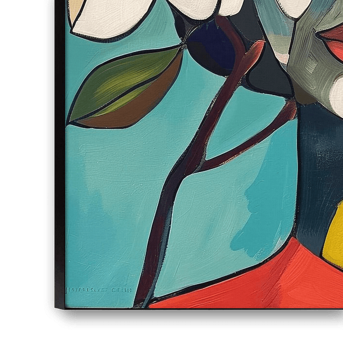Het kleurgebruik, met levendige tinten zoals rood, geel en blauwgroen, creëert een dynamisch contrast dat opvalt in elke ruimte. De eenvoudige, gestileerde vormen en de abstracte elementen maken dit werk veelzijdig en geschikt voor verschillende interieurstijlen. Het schilderij nodigt de kijker uit om de harmonie tussen mens en natuur te waarderen, en voegt tegelijkertijd een gevoel van verfijning en creativiteit toe aan de omgeving.