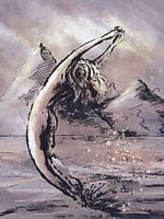 Dit abstracte kunstwerk is gemaakt met paarse, zalm roze en gele tinten. Je ziet op dit kunstwerk een vrouw die in de branding een sierlijke curve maakt. De dame neemt met haar blote lichaam een duik in het water. Op de achtergrond zie je bergen en een schemer lucht.