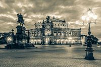 Zwart-wit foto Semperoper aan de Theaterplatz in Dresden bij nacht.