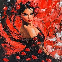 Dynamisch en romantisch schilderij van een betoverende Flamenco danseres met bloemen in rood en zwart.