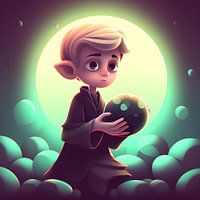 Het artwork toont een jonge jongen in een gewaad die een zwarte bal vasthoudt in een 2D-gamekunststijl. Het dromerige portret heeft een levendig kleurenschema en subtiele kleurovergangen die de algehele sfeer benadrukken. De pulpachtige stijl en cartoonachtige kenmerken voegen een grillig tintje toe aan de compositie en stimuleren de verbeelding van de kijker.