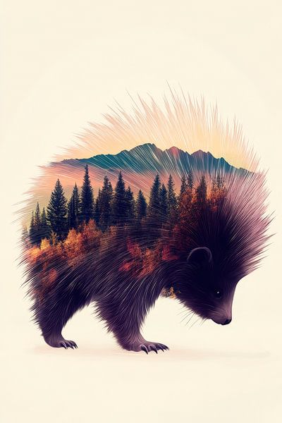 Een fascinerend dier wiens stekelige silhouet een dromerig landschap verbergt - majestueuze bergen en kleurrijke bossen smelten samen tot een harmonieus kunstwerk. Deze creatieve voorstelling springt in het oog en voegt een vleugje natuur en fantasie toe aan de woonkamer, perfect voor een ontspannen verblijf.