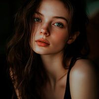 Met haar mysterieuze blik en zachte, stralende ogen straalt ze een fascinerende aantrekkingskracht uit. Haar wilde, volumineuze haar omlijst haar delicate gezicht, terwijl de zachte contouren haar jeugdigheid benadrukken. In deze sfeervolle lichtstemming is een melancholische elegantie voelbaar die de kijker betovert.