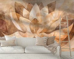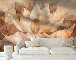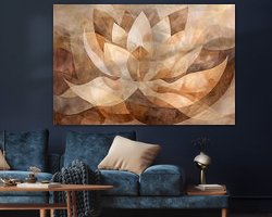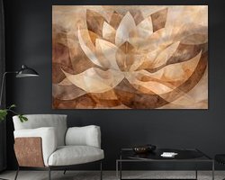 Dit prachtige ontwerp, geïnspireerd door de natuurlijke vormen van de lotusbloem, brengt een rustige en organische sfeer in elke ruimte. Het kleurenpalet in sepia tinten straalt een tijdloze elegantie uit die naadloos aansluit bij diverse interieurstijlen. De overlappende vormen creëren een spel van licht en schaduw, wat zorgt voor een dynamisch effect dat blijft boeien. Deze wanddecoratie is een subtiele eyecatcher die warmte en diepte toevoegt aan de omgeving, ideaal voor wie houdt van een serene en tegelijk moderne uitstraling. Het kunstwerk nodigt uit tot contemplatie en kan gezien worden als een symbool van zuiverheid en spirituele groei, eigenschappen die de lotusbloem eigen zijn.