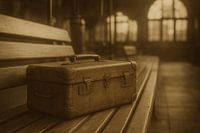Een verweerde koffer ligt op een lange houten bank in een rustige stationshal. Warm sepia-licht valt door hoge ramen en tekent zachte schaduwen over de planken. De afgeronde vormen van de koffer contrasteren met de strakke lijnen van de banklatten en de metalen palen. De sfeer is stil en reflectief, alsof de tijd even stilstaat.…
