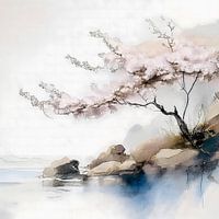 ZEN ART schilderij: Sereen Japans landschap met in bloei staande kersenbloesem.