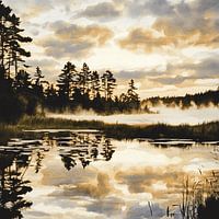 Een abstract landschap met duidelijke invloeden uit de Japandi-stijl: sereen, natuurlijk en perfect in balans. Zachte lichtbruine en groene tonen vloeien samen in een compositie met water en bomen die rust ademt.