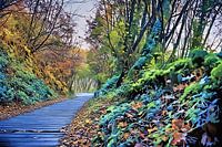 Deze afbeelding toont een rustig boslandschap waar een beekje doorheen stroomt. Het bos is dichtbegroeid met bomen waarvan sommige bedekt zijn met mos en klimop. De grond is bezaaid met gevallen bladeren en het beekje wordt begrensd door rotsen en vegetatie. De algehele sfeer is vredig en sereen, waardoor het een perfecte weergave is van ongerepte natuurlijke schoonheid.