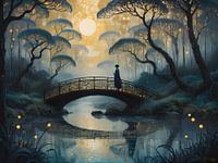 Dit kunstwerk vangt een mystieke, bijna surrealistische sfeer in een betoverd bos. De compositie toont een figuur die in contemplatie over een sierlijke brug staat, terwijl het maanlicht door de bomen schijnt en het water rustig weerspiegelt. Het gebruik van licht en schaduw roept een sfeer van rust en introspectie op, die doet denken aan de werken van kunstenaars als Maxfield Parrish, met zijn dromerige verbeelding en nauwkeurige aandacht voor detail.