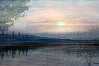 Een spiegelglad meer spiegeld de bomen langs het meer. Samengebracht met een zacht warme zonsondergang en grillig getekende rietkragen, ontstaat een intiem dromerig en sprookjesachtige sfeerbeeld.