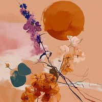 Een moderne abstracte bloemencompositie met levendige oranje bloemen, tere pastelkleurige bloemblaadjes en diep groenblauwe bladeren tegen een warme perzikkleurige achtergrond, geaccentueerd door een fel oranje zon. Het kunstwerk combineert organische vormen met zachte penseeltexturen voor een dromerig, eigentijds gevoel.
