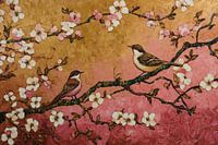 Op de tak zitten twee musjes: één in een gouden tint, de ander in een subtiele roze kleur, hun vleugels lichtjes opgetild in een vredige houding, alsof ze samen de bloesems bewonderen en hun eigen serenade zingen. Het paletmeswerk van de achtergrond, geïnspireerd door de expressieve stijl van Van Gogh, creëert een dynamische textuur die de levendige energie van het moment versterkt. Dit schilderij is een ode aan de schoonheid van de natuur, de vreugde van de lente, en de harmonie tussen vogels en bloemen.