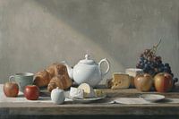 Serene Breakfast Elegance - Dit stilleven schilderij toont een zorgvuldig gearrangeerde theetafel met een witte theepot, glanzende croissants, rijpe appels, een schaal met diverse kazen en een tros donkere druiven.