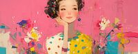Serene Color Burst - Dit vrouwen schilderij toont een jonge vrouw met een sereen gezicht, leunend op haar hand tegen een levendige, abstracte, kleurrijke achtergrond van felle, gemengde bloemen en vlagen van roze en gele verf.