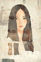 Serene Complexity - Dit vrouwen schilderij toont een portret van een vrouw wiens gezicht, opgebouwd uit verschillende texturen en aardetinten, een introspectieve of serene uitdrukking presenteert op een minimalistische, textuurrijke achtergrond.
