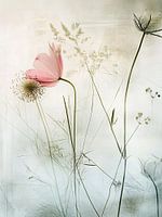 Serene Dance of Nature - Dit bloemen schilderij toont een etherisch tafereel van delicate flora waaronder een prominente roze bloem en fijngetekende grassen tegen een zacht getinte achtergrond.