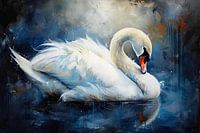 Serene Eclipse - Dit zwanenschilderij toont een majestueuze witte zwaan tegen een dynamisch en diep blauw-zwart achtergrond, verrijkt met abstracte penseelstreken en subtiele hints van oranje en geel in de bovenhoek. Het hoofdonderwerp, de zwaan, is met grote zorg en detail weergegeven, en straalt een bijna serene kalmte uit. De…