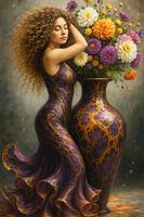 Een mooie jonge vrouw met lang, krullend, lichtbruin haar die een vloeiende paarse jurk draagt met gouden organische patronen. Met gesloten ogen staat ze naast een grote vaas met een vergelijkbaar paars en goud patroon. De vaas is gevuld met een weelderig boeket van diverse bloemen in tinten wit, geel, oranje en paars. De sfeer is artistiek en dromerig.