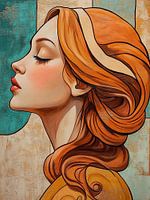 Serene Gaze - Dit vrouwenportret schilderij toont een profiel van een jonge vrouw met elegant gestroomlijnd, roodbruin haar en een sereen gesloten ogen, tegen een rustgevende, blauwgroene achtergrond.