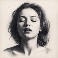 Dit portret toont een vrouw in een moment van diepe rust en introspectie. Haar gesloten ogen en ontspannen mond geven haar een serene uitstraling. Met zachte potloodstreken heb ik geprobeerd haar innerlijke rust en de kwetsbaarheid van dit intieme moment vast te leggen. De fijne details en de zachte schaduwen accentueren haar kalme uitstraling en nodigen de kijker uit om mee te dromen.