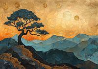 Serene Horizon Escape - Dit natuurlijke landschapsschilderij toont een uitgestrekte boom met grillige takken centraal op een reeks gelaagde heuvels, onder een hemel met gouden cirkelvormige patronen.