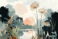 Serene Nature’s Reflection - Dit landschapsschilderij toont een serene, abstracte weergave van water met reflecties, omringd door wilde bloemen en vegetatie in zachte pastelkleuren, waardoor een dromerige sfeer ontstaat.