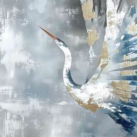 Sierlijke reiger, uitgebeeld in een gestroomlijnde, minimalistische stijl tegen een abstracte, textuurrijke achtergrond. De compositie speelt met het contrast tussen de fijne details van de reiger en de brede, ruwe penseelstreken van de omgeving. Het gebruik van goud en blauwe accenten verrijkt de visuele ervaring en voegt een gevoel van luxe en kalmte toe. De reiger, bekend om zijn statige rust en elegantie, lijkt in dit werk te worden verheven tot een symbool van serene schoonheid en gratie.