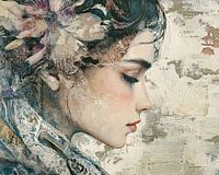 Serene Schoonheid - Dit vrouwenportret schilderij toont een serene vrouw met een verfijnde blik en versierd met bloemmotieven, waarbij zachte pastelkleuren en textuurrijke verftechnieken in een moderne Rococo-stijl zijn gebruikt.