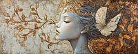 Serene Vrouw | Gouden Blad Vlinder - Dit vrouwen schilderij toont een serene vrouwengezicht met gesloten ogen, omgeven door gouden bladeren en een delicate witte vlinder, allemaal afgebeeld tegen een getextureerde, goud-bruine achtergrond die de rijke details van een Rococo-stijl bevat.