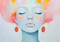 Serene Vrouw Rode Sieraden - Dit moderne vrouwenportret schilderij toont een serene vrouw met gesloten ogen en opvallende rode oorbellen, omlijst door een zacht kleurenspel van roze, blauw en oranje tinten die subtiel in elkaar overlopen.