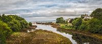 Een panoramisch uitzicht op de haven van Buncrana, met de haven en het omringende groen op een bewolkte zomerdag, met uitzicht op Ierse vervallen gebouwen. De foto legt zowel stedelijke elementen vast zoals boten die aanmeren aan de kustlijn als natuurlijke kenmerken zoals rivieroevers bedekt met bemoste, hoge rotsen. Deze groothoekopname is gemaakt vanaf bijna de grond en legt het contrast vast tussen zeewater, lucht, bomen, huizen en bergen in de verte.