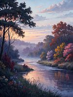 Deze afbeelding toont een rustig riviertafereel in de schemering. De zon gaat onder (of komt op, afhankelijk van de interpretatie) en werpt een zachte, warme gloed over de hemel, die wordt gesierd door verspreide wolken met delicate pasteltinten. De voorgrond is weelderig begroeid met hoge grassen en een verscheidenheid aan bloeiende…
