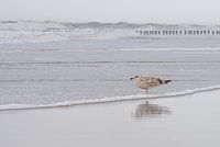 De meeuw heeft een mooie beige grijze tekening op zijn vleugels. Onder de meeuw zie je de reflectie van de meeuw in het kleine laagje water wat op het strand ligt. De meeuw zelf staat net met zijn poten in het water, net achter het kleine witte schuimlaagje.