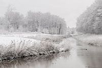 De takken van de bomen en het riet zijn nog beladen met sneeuw.
