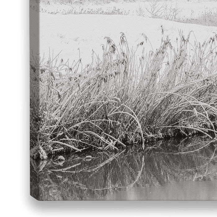 De takken van de bomen en het riet zijn nog beladen met sneeuw.