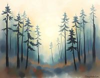 Dit ontwerp heeft een minimalistische maar suggestieve weergave van een dicht bos. Hoge, slanke bomen worden weergegeven als donkere silhouetten tegen een zacht vervaagde, verlopen achtergrond die een nevelige of mistige sfeer suggereert. Het palet is gedempt en rustgevend, waarbij de achtergrond overgaat van een bleke, warme lucht aan…