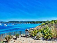 De afbeelding toont een rustige kustscène met een klein, weelderig eiland omringd door helderblauw water. Verschillende boten liggen voor anker in de buurt en iemand rijdt op een jetski en laat een spoor van wit schuim achter. De lucht is helder en versterkt de levendige blauwe tinten van de zee en de lucht, waardoor een schilderachtige en serene sfeer ontstaat.