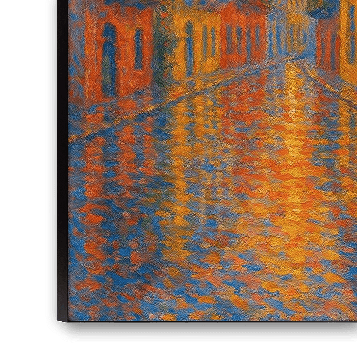 Het penseelwerk is weelderig, gelaagd met korte, ritmische stippen die pulseren met vochtigheid en beweging. Elke tint - koraal, turquoise, indigo - vindt harmonie in contrast. De straat zelf wordt een rivier van licht die naar de horizon stroomt.