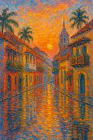 Serene zonsondergang in Cartagena is meer dan een landschap; het is een moment van overgave - aan kleur, aan de avond, aan de muziek van licht op steen. In de geest leeft Monet's eeuwige fascinatie voor reflectie, maar de ziel behoort geheel toe aan het Caribisch gebied. Een schilderij van warmte en ritme, perfect voor ruimtes die het leven, reizen en de romantiek van het gouden uur vieren.